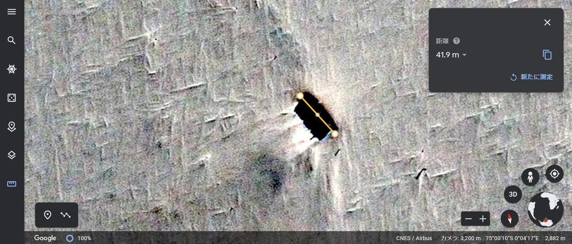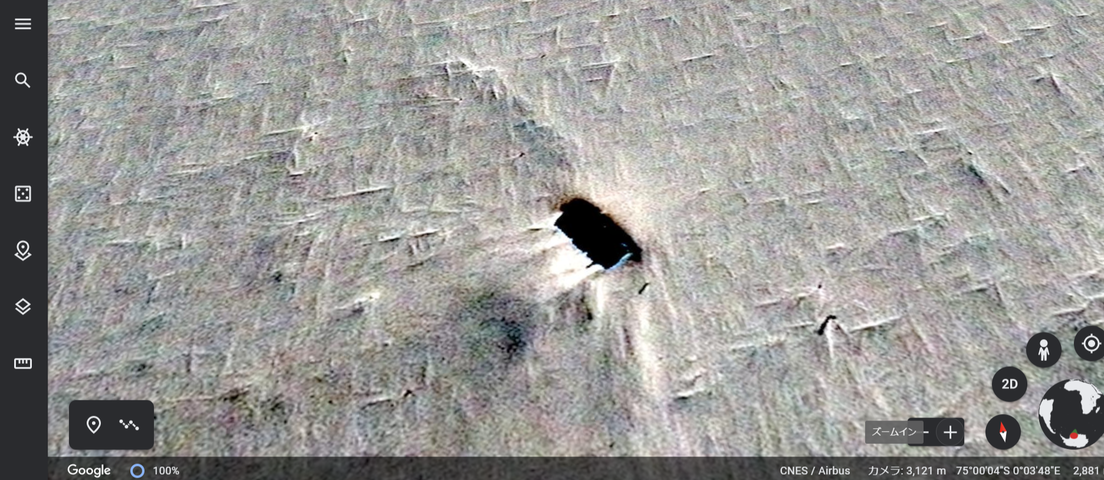 ここの衛星写真は少しモザイクがかかっていて、あの有名な氷が溶けてきてUFOらしきものが露出している写真現場とされています。