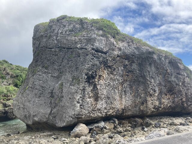 約34年前、大神島では島を一周するための道路の建設を始めました。建設予定地にあった大きな岩をブルドーザーで砕こうとしたところ、ブルドーザーの爪が折れてしまったそうです。